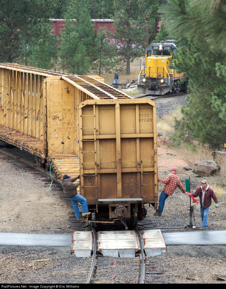 The St Maries River Railroad crew is pulling the UP interchange cars off the blocked main line to Spokane. As the end of the train comes around, the St Maries crew jumps on and hands the red flag back to the UP brakeman who will momentarily throw the switch so his train can depart.