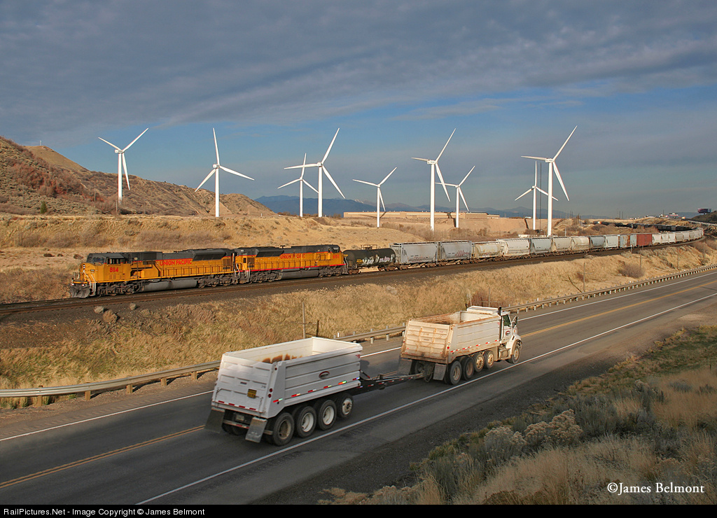 A pair of EMD SD9043MAC's lead UP's daily Salt Lake-Denver (MRONY) manifest at the mouth of Spanish Fork Canyon. Nine brand new wind turbines constitute Utah's first wind farm, capitalizing on the strong winds that howl through Spanish Fork Canyon every morning.