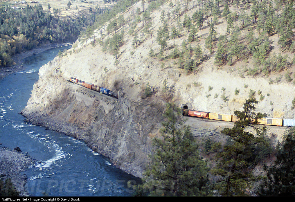 Two SD40-2's are westbound north of Lytton beside the Thompson River with grain and sulpher loads.