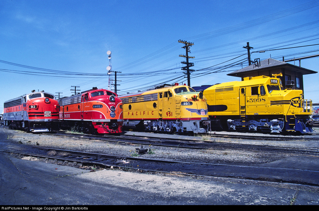 | Operation Lifesaver power at SP Oakland shops, arranged by an unnamed railfan hostler. WP 913-A and E9 6051 from the Cal State Rail Museum, UP 951 and ATSF FP45 5948. SP foreman came along and tossed us all out right after photo. |