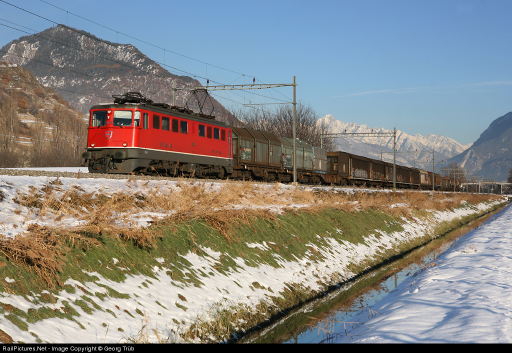 | Ae 6/6 11470 is pulling a freight from Sierre through the Rhone valley to Lausanne shunting yard. Above the train in the far distance the 3934 m high Bietschhorn. It is very rare to find snow in the valley bottom in novembre! |