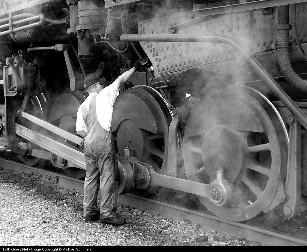 The Fireman oils the moving parts before Mountain Thunder departs for Frostburg.