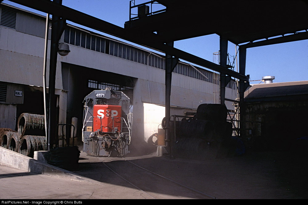 | A UP switch job out of J-Yard with SP 4871, one of the Helm Leasing GP38-2s, is on the City Fibers spur (Violet Alley). The spur curved through a steel company. This has all changed because of the Alameda Corridor. |