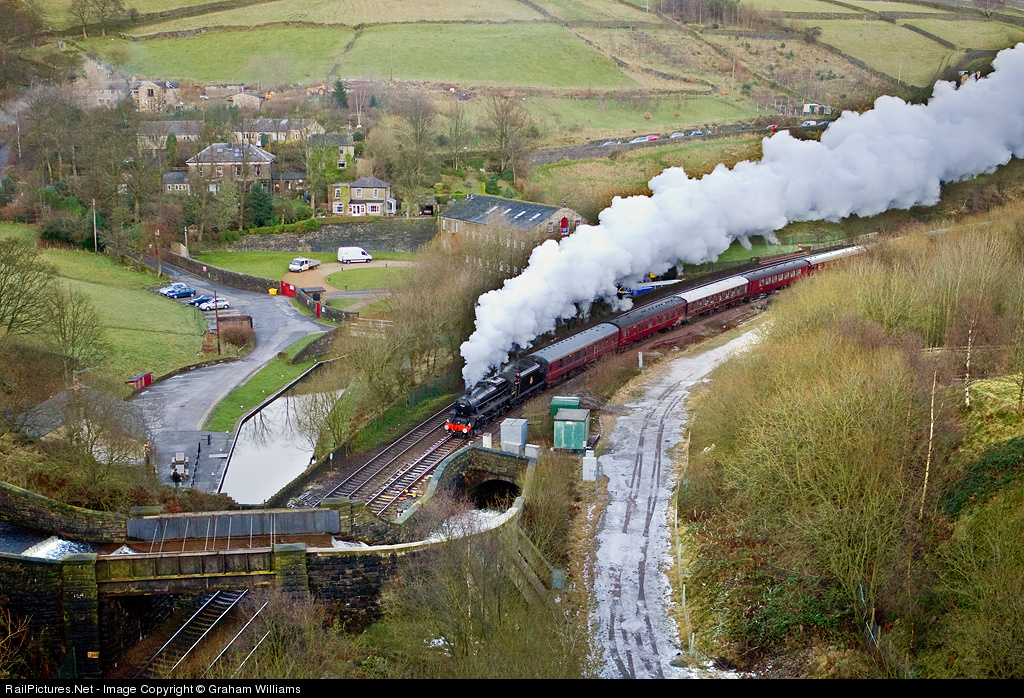 | The Cotton Mill Express, a main line special that has run each month in 2008 on a round trip from Manchester round parts of East Lancashire and West Yorkshire. Black Five no. 45407 is seen here about to enter Standedge tunnel at Marsden running the circuit the opposite way to usual. The bridge in front of the loco is actually an aqueduct. You can see the water flowing along and being carried above the tracks. |