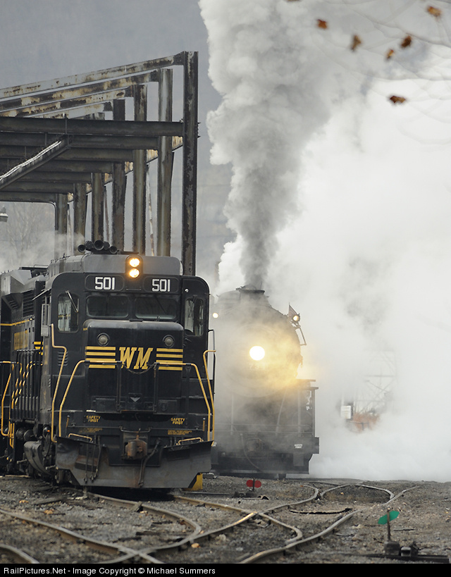 #734 peeks through the steam from behind #501 as she is coupled to the passenger cars before making the trip to Frostburg.