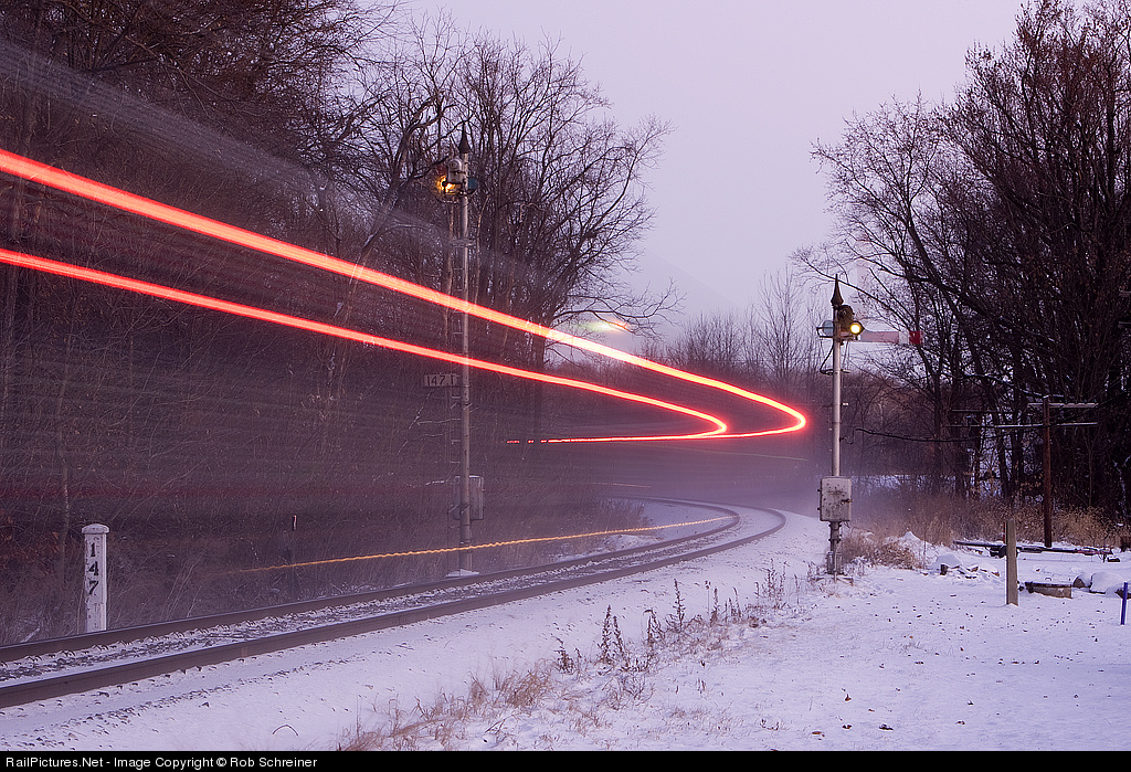 In predawn light, northbound Amtrak splits the semaphores and the shorty blade drops in the ghostly image.