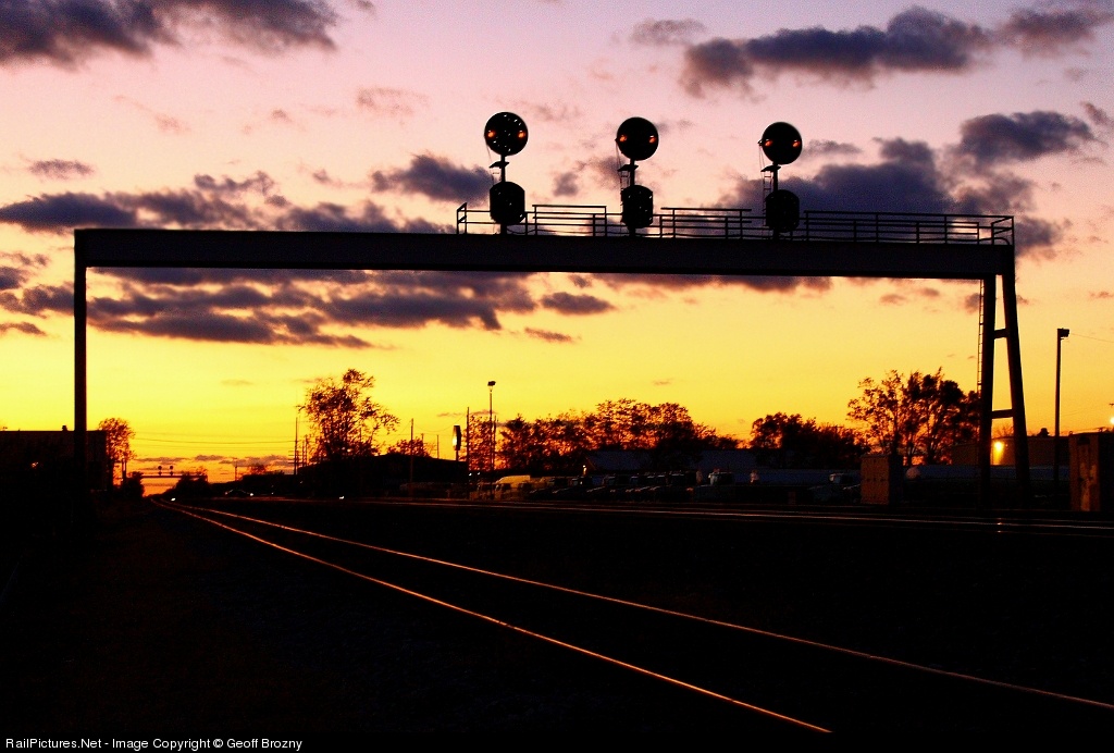 The sun sets behind the old PRR signal bridge at MP 146, this was the former PRR Xenia line.