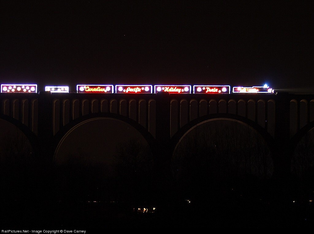 The Holiday train stops on top of the Tunkhannock Viaduct. A huge crowd has gathered on both sides of the bridge to admire the sight.