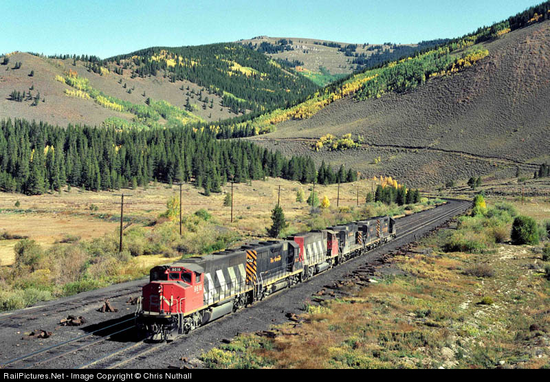 | With the fall colours of the Aspen starting to appear, helpers 9616(CN) 3042 9607(CN) 3021 3022 3098 head away from the camera as they return to Minturn after assisting a westbound freight to Tennessee Pass. The D & RGW had six CN GP40s on loan for a short period to trial the then new Super Series creep control. Their lack of dynamic brake in Rio Grande territory seemed a little ironic though! |