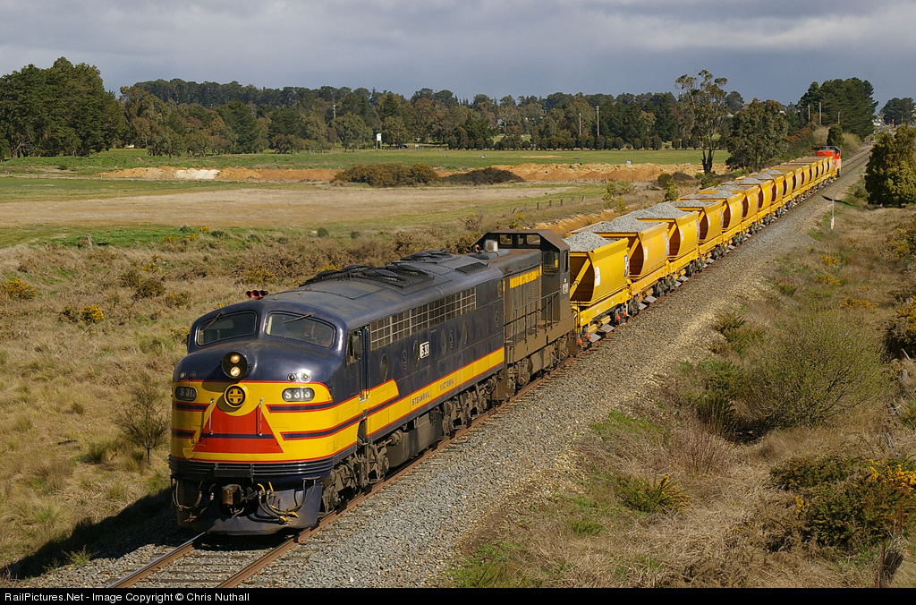 Repainted in a livery loosely based on the Louisville and Nashville Railroad from the US for the television mini series "Pacific", hired to El Zorro "preserved" S313 leads a ballast train heading north from Ballarat, on the Maryborough line, with T357 in push pull mode with Y145.
