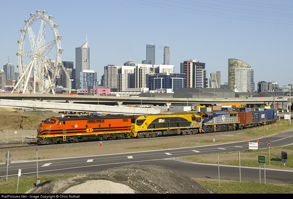 | Hired GWA GM43, QRN 2819 and hired CFCLA VL357 head a late running QRN 2AM6 shuttle from North Dynon onto the West Swanson Docks line in West Melbourne. The recently constructed, but not yet open, Southern Star observation wheel forms an unusual backdrop. |