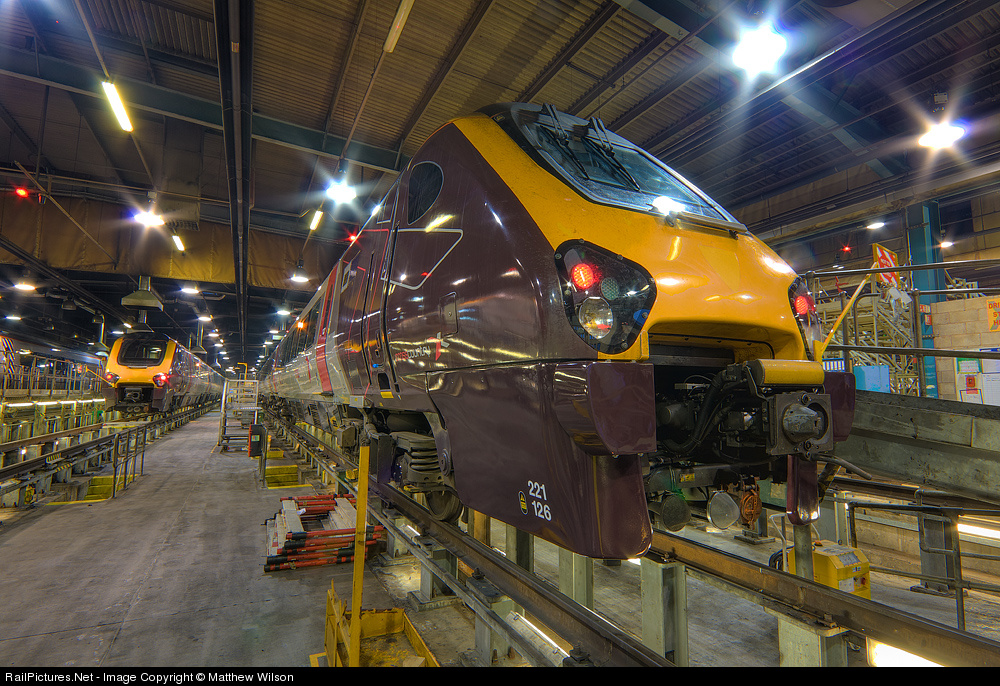 | 221126 receives attention before returning to service as the first Voyager to have its shop removed. Sister unit 220004 is on the left. This shot featured on the cover of Rail magazine issue no 607 |