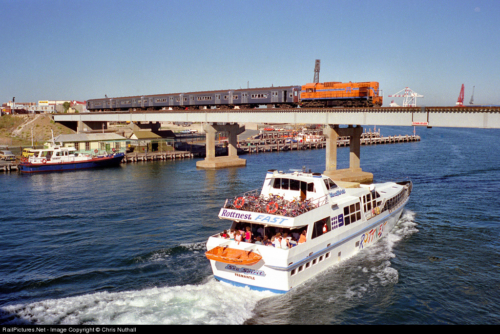 | With silver cars still on loan from Queensland for the 1987 America's Cup challenge, A1511 crosses the Swan River at Fremantle with a suburban service to Perth on April 6 1988, while the Sea Spirit to nearby Rottness Island departs from the jetty. |