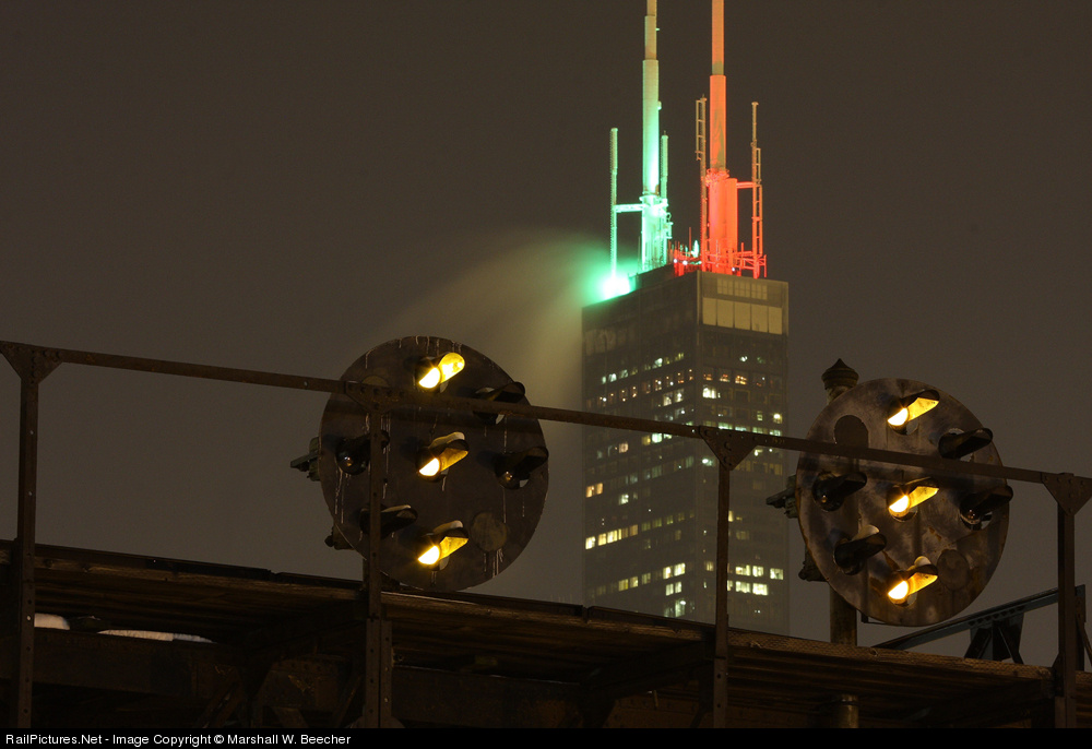 | On a cold winter's night, the ex-Pennsy Position Light Signals are framed against Chicago's Sears Tower, lit up for the holidays. |
