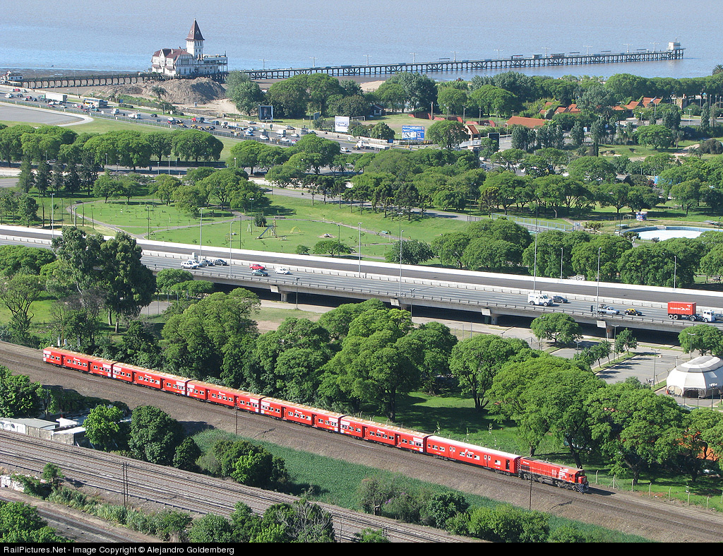 Inbound Ferrovias train approaching to Saldías station. Rio de la Plata and Fisherman's Club seen at background