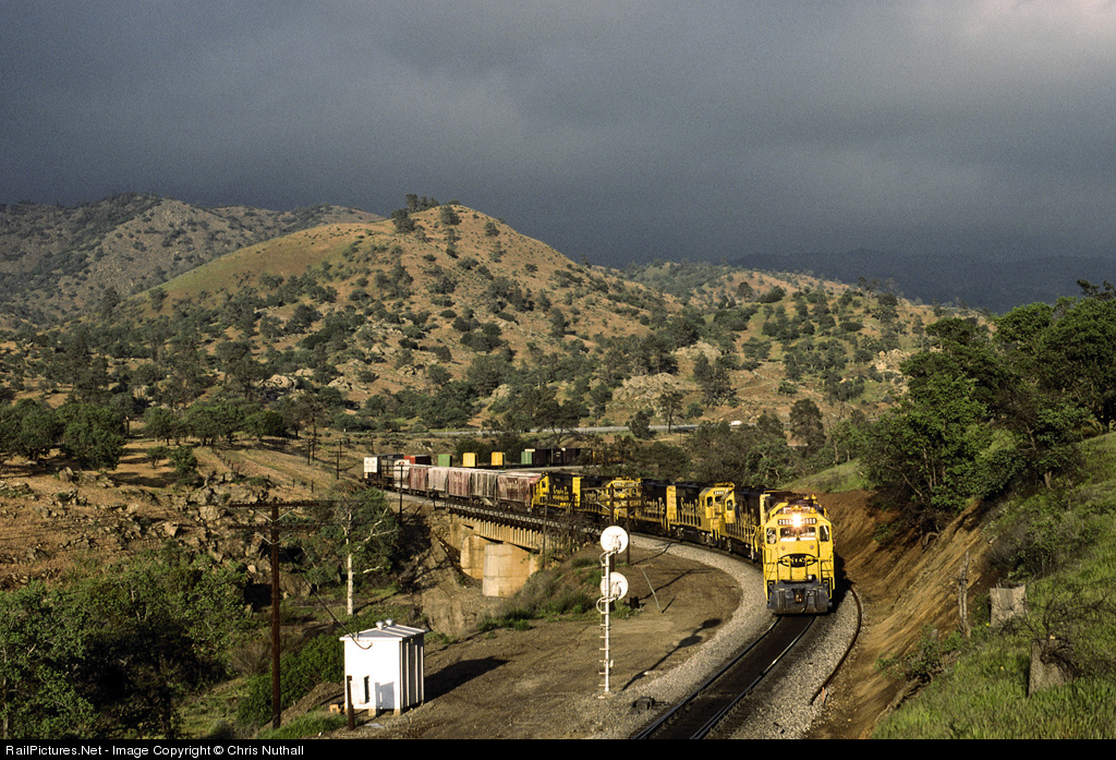 Delayed due to an earlier derailment near Barstow, westbound AT&SF freight, behind 2908 3676 2871 2889 3024 2851 3675, tries to beat an afternoon storm as it comes off the lower of section Tehachapi Loop