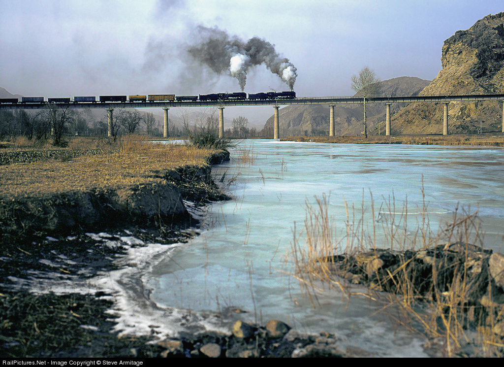 | Sulphurous deposits lend strange colour hues to the frozen waters of the river that weaves beneath Kinmiaoxiang's magnificent Biligou viaduct. QJ 6639 pilots 6851 as they work eastbound in the final year of steam in an unforgettable setting. Steam still lingers on in China, but oh for the days when Jingpeng pass drew us like a magnet. |