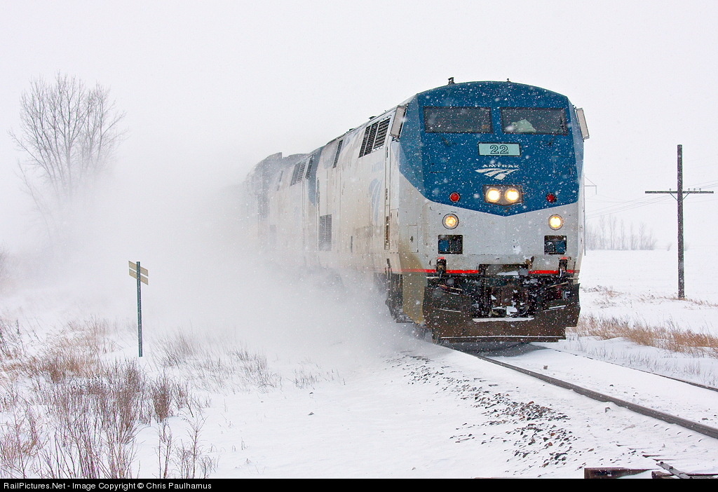 | The westbound Empire Builder storms into Grand Forks about 35 minutes before its eastbound counterpart shows up. Severe weather has greatly impacted Amtrak operations across the northern tier leading to these rare daylight appearances and meets in Grand Forks. And, yes, I ran away like a spooked cat after this shot trying to avoid the blizzard that was coming my way! |
