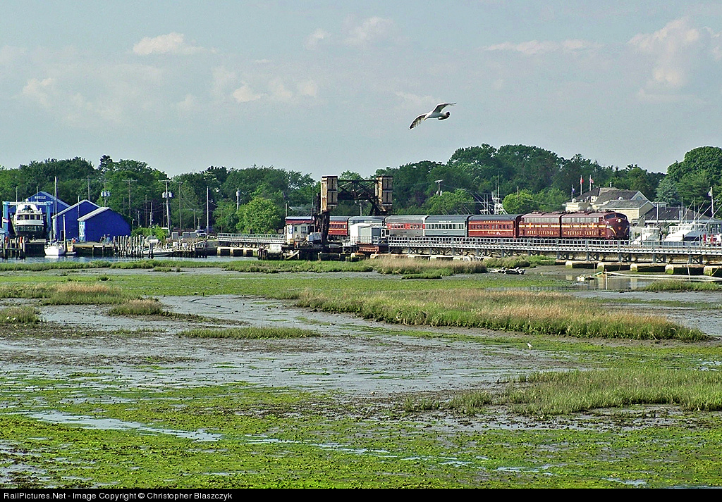 | A seagull wants a closer look at PRR E8s 5809 and 5711 as they lead a special over the Manasquan River drawbridge and into Point Pleasant Beach. The Hoboken to Bay Head round trip was run to celebrate the 150th anniversary of Railway Age magazine and to benefit the APTA scholarship fund. |