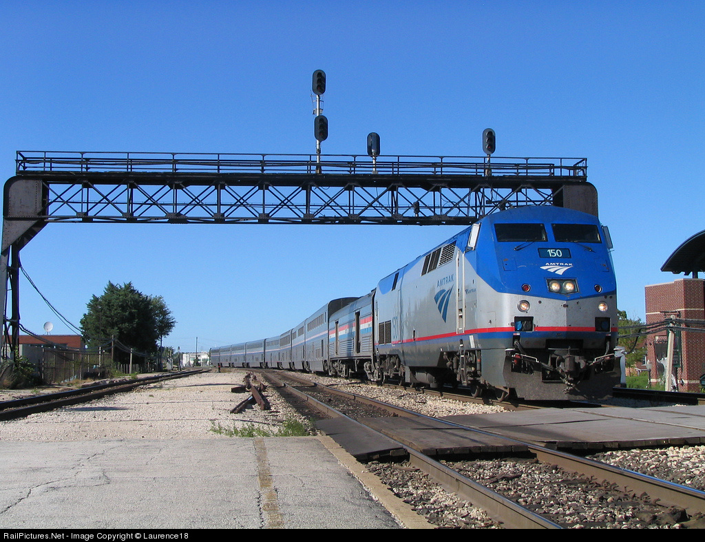 | Amtrak 21, the Texas Eagle, approaches Joliet under the Santa Fe signal bridge. |