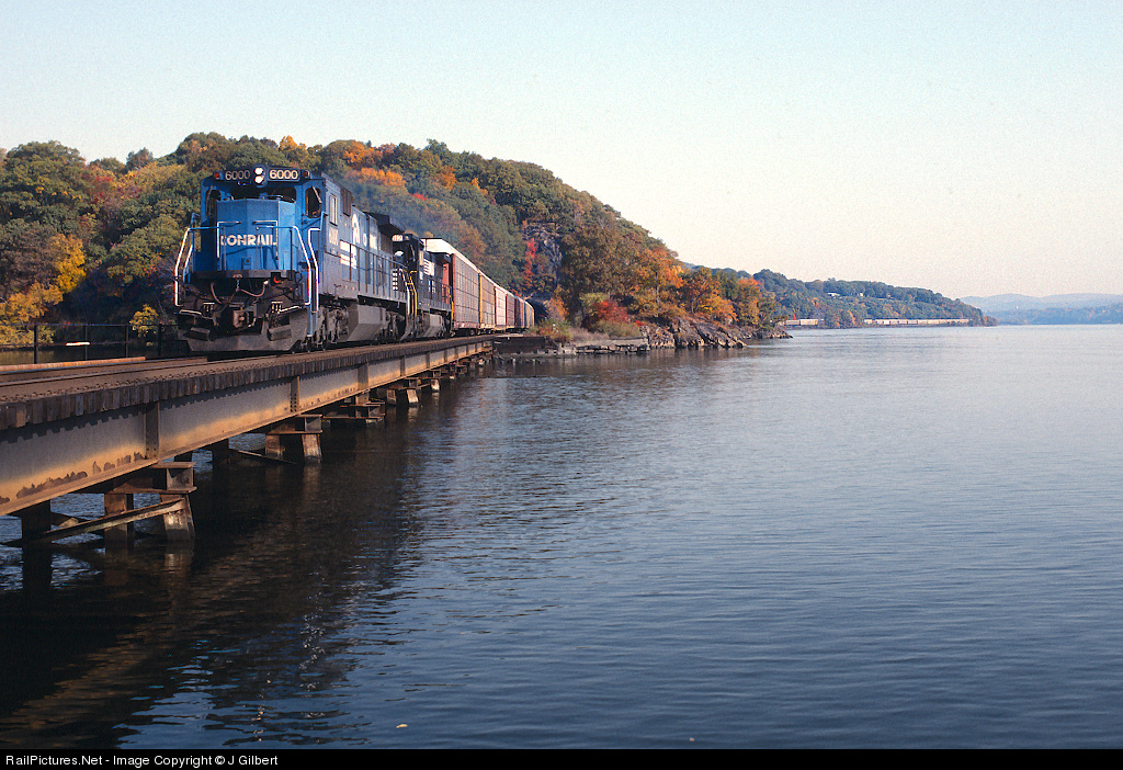 Conrail C39-8 class unit 6000 charges out of Fort Montgomery Tunnel and over Popolopen Creek. You can see the long string of autoracks trailing behind for over a mile up the Hudson.