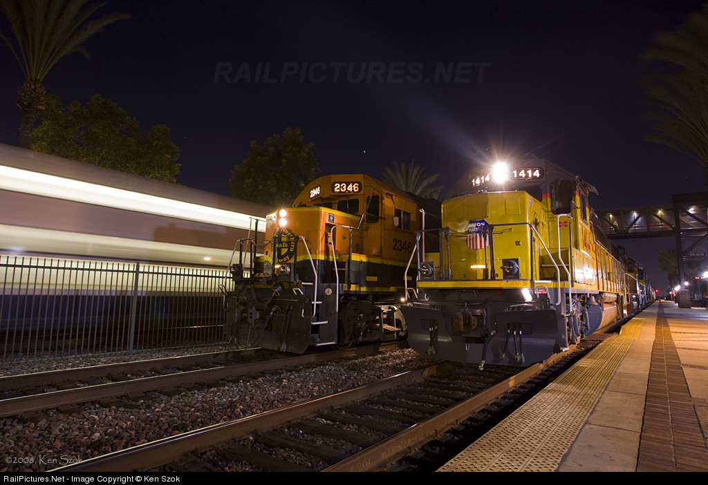 | A rare sight these days happened when UP 1414 and BNSF 2346 stopped at the Fullerton train station to wait for a Metrolink commuter train to cross over to track 3. It was nice to see two EMD standard cab four axle units side-by-side on the main line in 2008. |