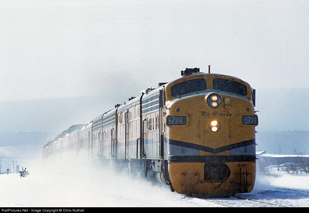 Running through a light snow shower, the westbound Rio Grande Zephyr creates its own flurry as it passes through Fraser at the end of January 1982 behind 5771 253 5762 5763.