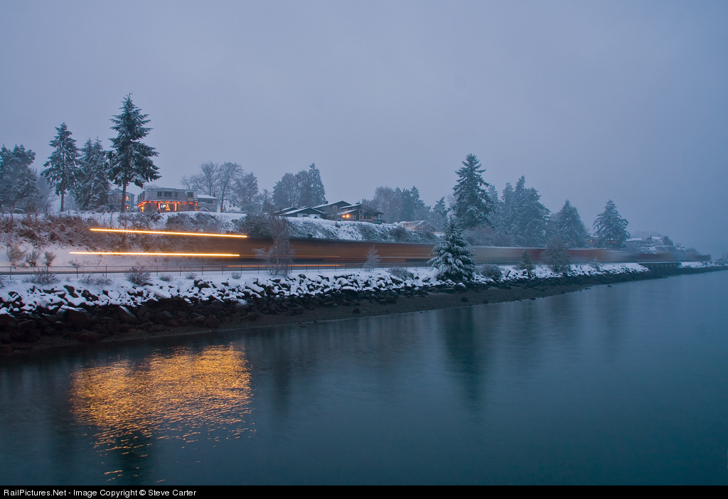A sight not often seen - heavy sea (sound) level snow. A UP northbound manifest rolls through snow and past some Christmas lights in Steilacoom.