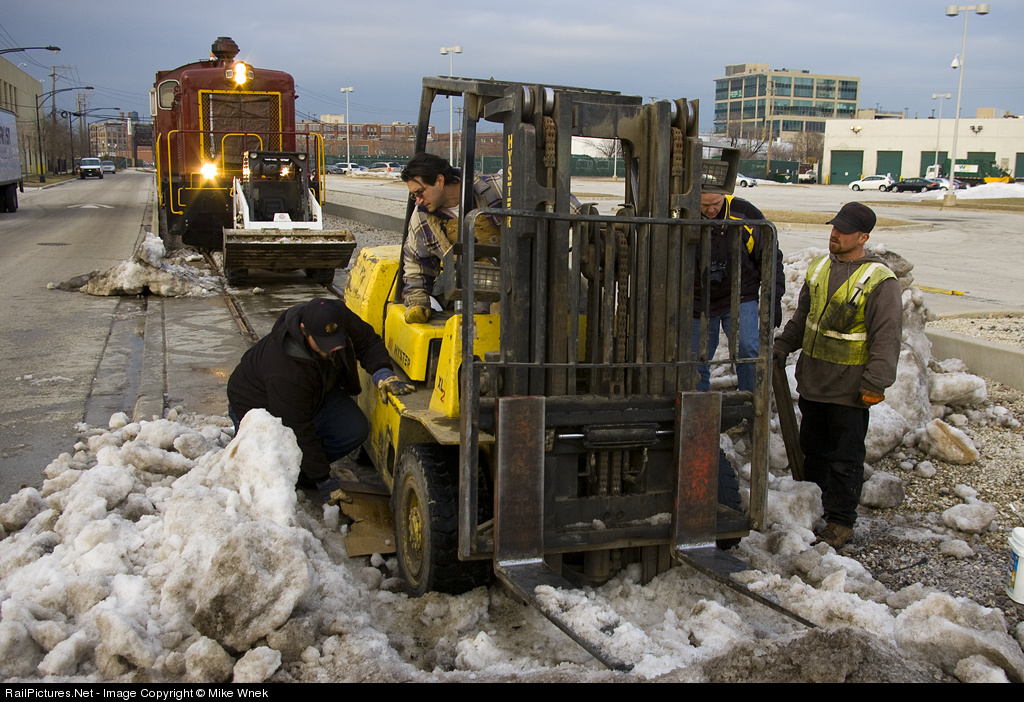 What does it take to get rid of a stubborn pile of snow and ice? A Bobcat, two forklifts, two crew members, and some employees at Big Bay lumber. What does it take to get one of those forklifts unstuck? Another forklift, two crew members, some employees at Big Bay Lumber, and several railfans suggesting ideas.
