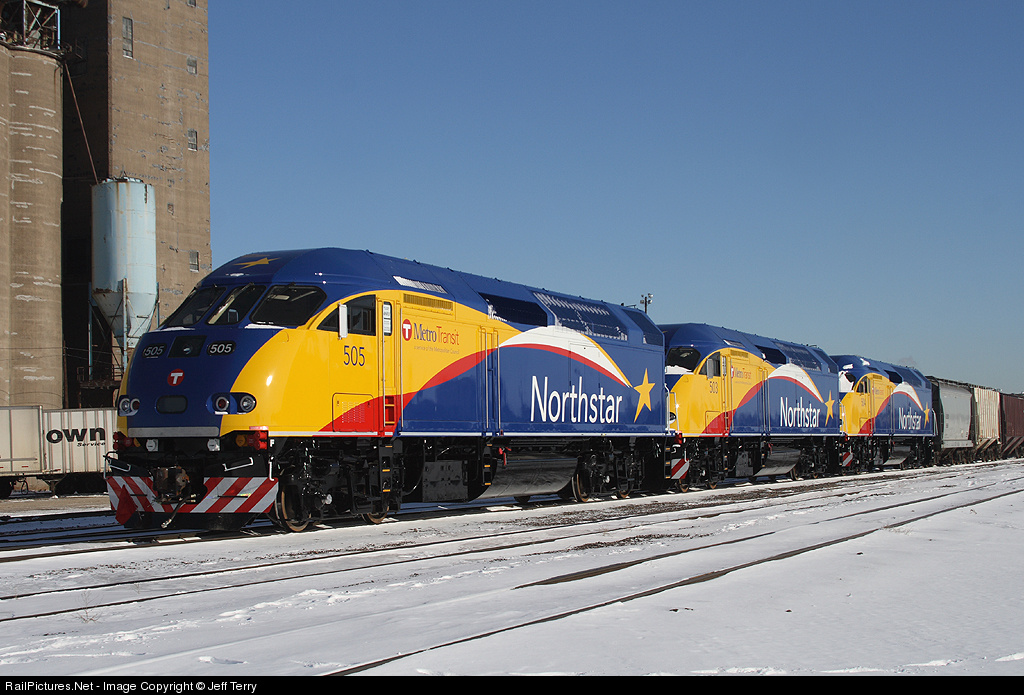 | Three brand new Northstar Commuter Rail MP36PH-3Cs sit in the sun at East Minneapolis yard after delivery. Northstar plans to begin operations in late 2009 on 40 miles of track between Big Lake and Minneapolis. What a sharp paint scheme! |