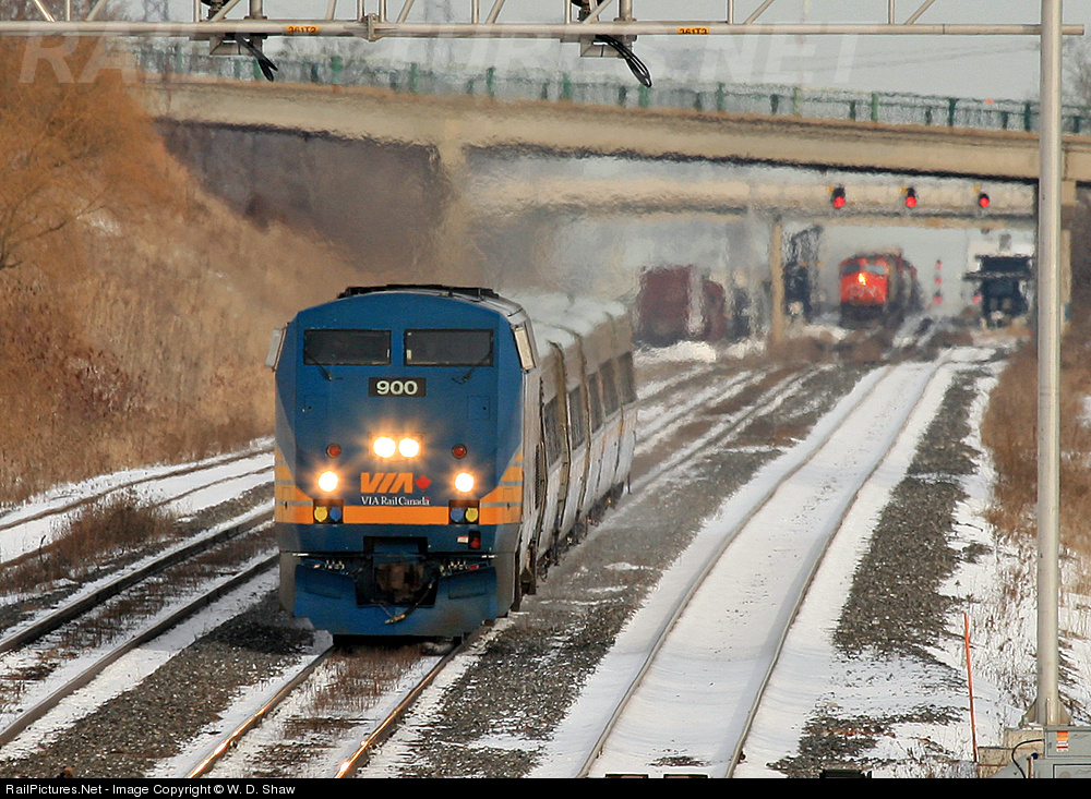 | CN 385 waits in the background framed by the inclined spans of the Lemonville Road and Waterdown Road bridges (which climb out of the bed of prehistoric Lake Iroquois and up the beginnings of the Niagara Escarpment) while VIA 73 passes the signals protecting the plant at Snake. |