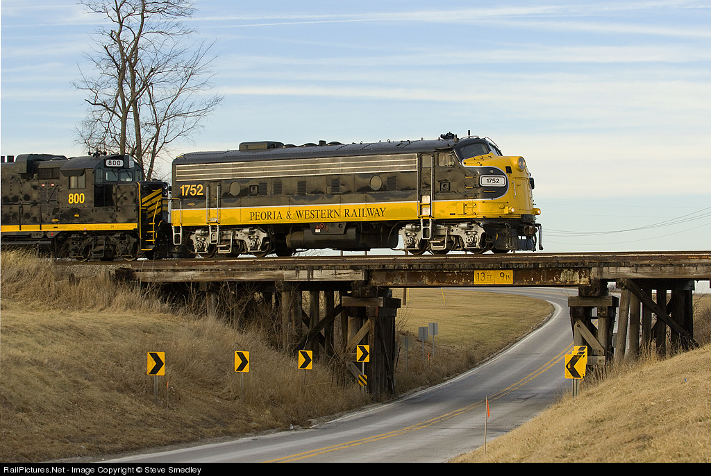 With Peoria & Western Railway down to one operating FP9, the Canton Cannonball has made a rare trip all the way west to meet the Keokuk Junction job out of Keokuk, at Laharpe, Illinois. With sister 1750 in the shop with a blown air compressor and leaking radiators, 1752 is paired with GP8 800 and a GP20R.