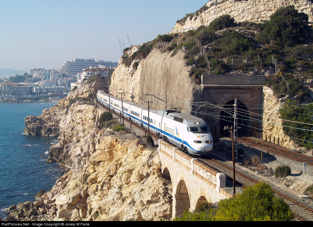 | A class 101 trainset on a "Euromed" service Alicante-Barcelona, running between Sitges and Vilanova. These trainsets will be refurbished for high speed purposes on the spanish HSL. |