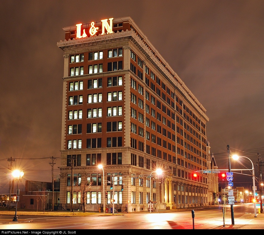 This magnificent building once served as headquarters of the L&N. Thankfully the red and yellow scrolling neon sign remains, even though the L&N is long gone and CSXT no longer has offices here. Located in downtown Louisville at the corner of Broadway and 9th St./Roy Wilkins Ave.