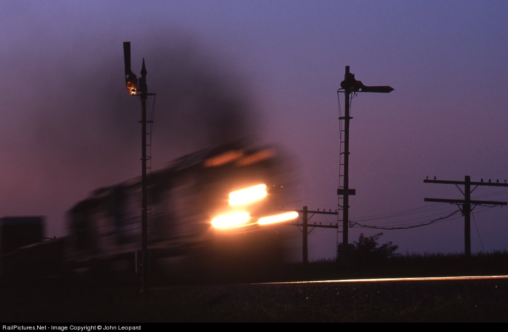 Southward CSX train at dusk splitting the blades at South Romey, Indiana. Scanned from a Fuji Provia 100 slide. Note the bugs steaking in the head/ditch lights.