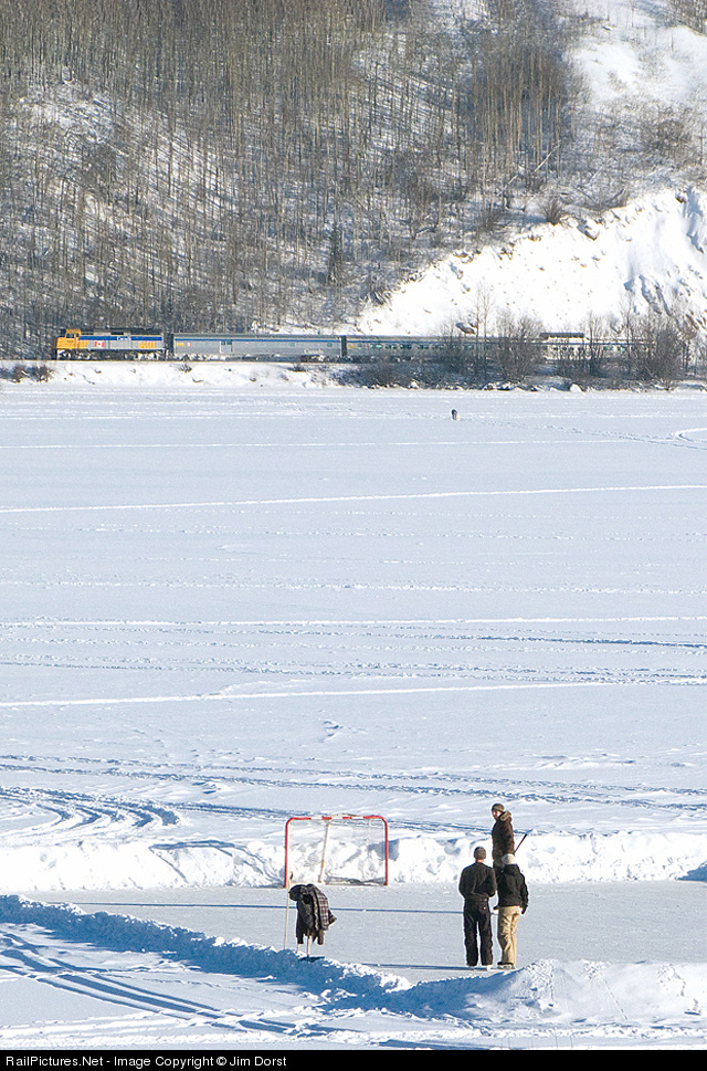 On New Year's Day some local boys organize a hockey game, and an ice fisherman on the far side of the lake stoops over the hole as the "Skeena" heads west.