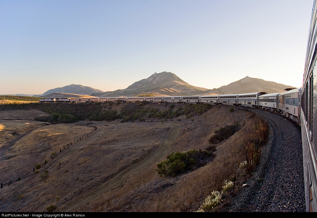 Amtrak's southbound Coast Starlight rounds Goldtree Horseshoe Curve, just minutes before arriving San Luis Obispo station
