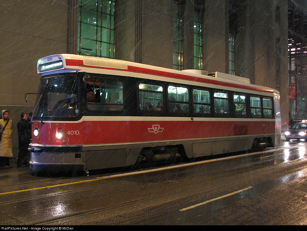 | It's a stormy Monday night in downtown Toronto as passengers off work wait to board a 504 streetcar out of the cold. This run has the first production UTDC Canadian Light Rail Vehicle (CLRV) 4010, but most passengers are just glad to get out of the snow! |