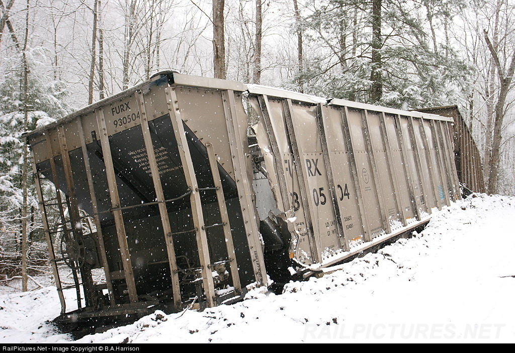 One of five coal hoppers that derailed and hit the ground, with a total of fourteen leaving the tracks loaded. RJ Corman had just finished loading a unit train at the National Coal loadout at Baldwin on New River when the accident occurred at MP 14, enroute to Oneida. Talking about a remote place on the branchline with no access in the middle of the Cumberland Mountains.