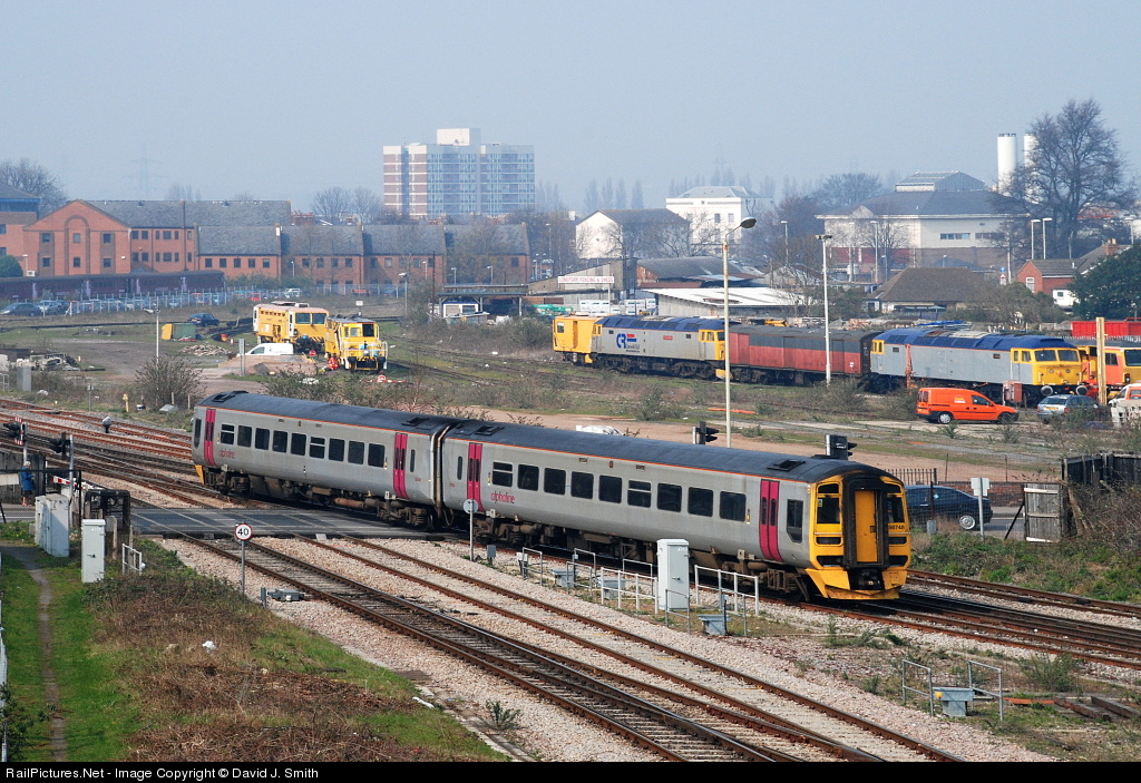 | A local service from Great Malvern to Taunton drifts into Gloucester,passing the Cotswold Rail depot in the background. |