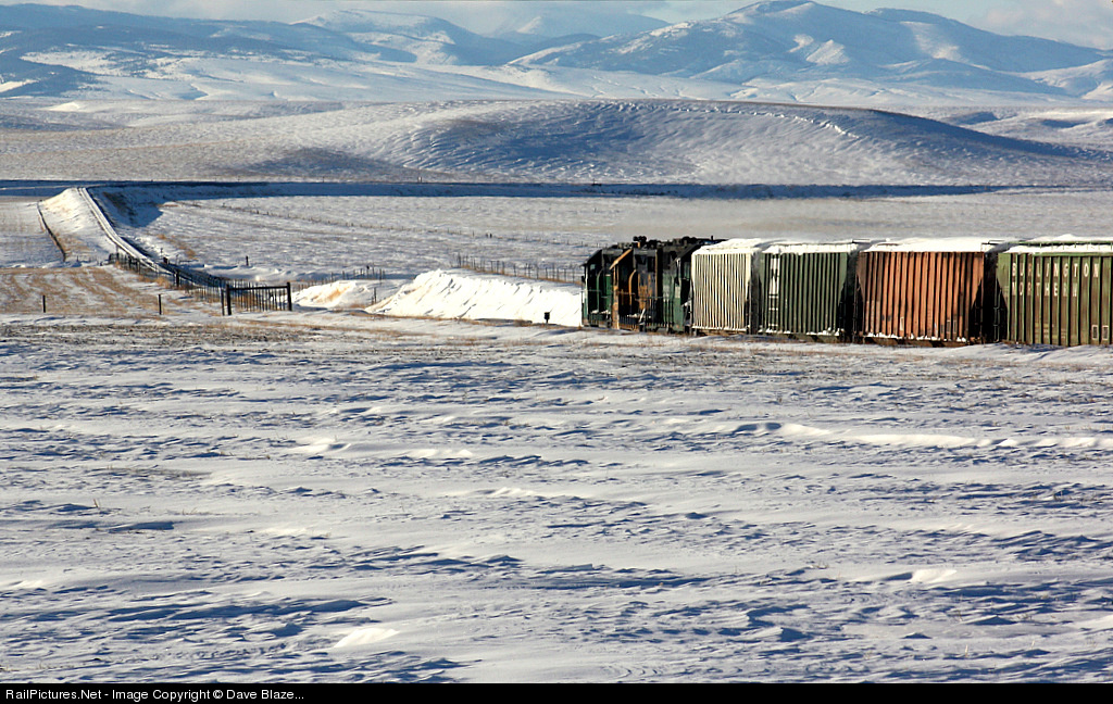 | After driving nearly four hours exploring the Laurel Sub with nary a peep on the radio suddenly it came alive just as we were about to leave and head off to explore the remnants of the Milwaukee Road in Lewistown. A Great Falls based local has finished its work on the branch and could be seen dropping down the ex Milwaukee Rd. Central Montana Line and calling for a track warrat to enter the Laurel Sub at Sipple. In this photo you can see the three geeps leading 29 loaded hoppers around the tight curve off the original Milwaukee alignment and on to the fills of the "new" connector build by the BN after they assumed operation of this line in the 1980s. The grade slicing across the middle of the frame is the Laurel Sub mainline (ex GN) and the junction point is MP 122.4. |