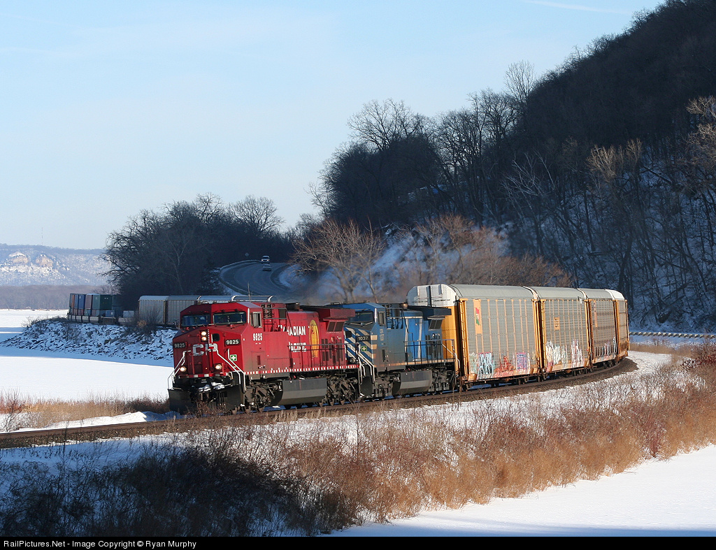 CP 9825 charges toward Red Wing with loads of auto racks and double stacks in tow while the natural beauty of the Mississippi River Valley provides the backdrop.
