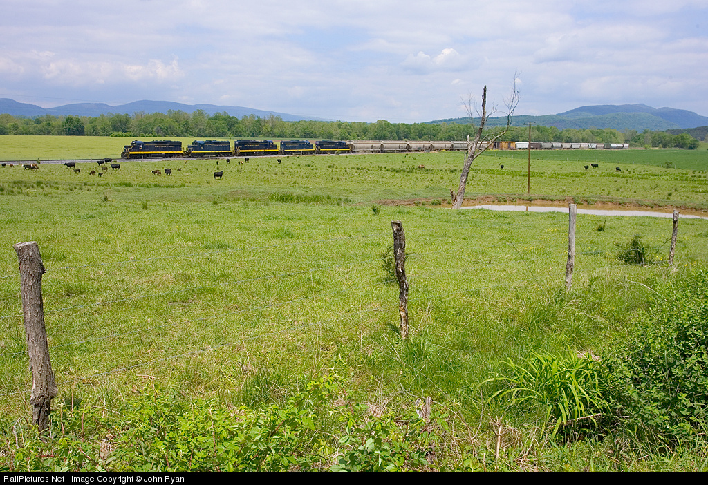 Most of the South Branch Valley's roster, a SD18/GP9/SD18/GP9/SD18 combination, is in charge of a healthy-sized train north of Moorefield on this muggy spring day. Some of the cows look on with interest, but most of them stampede away from the tracks.