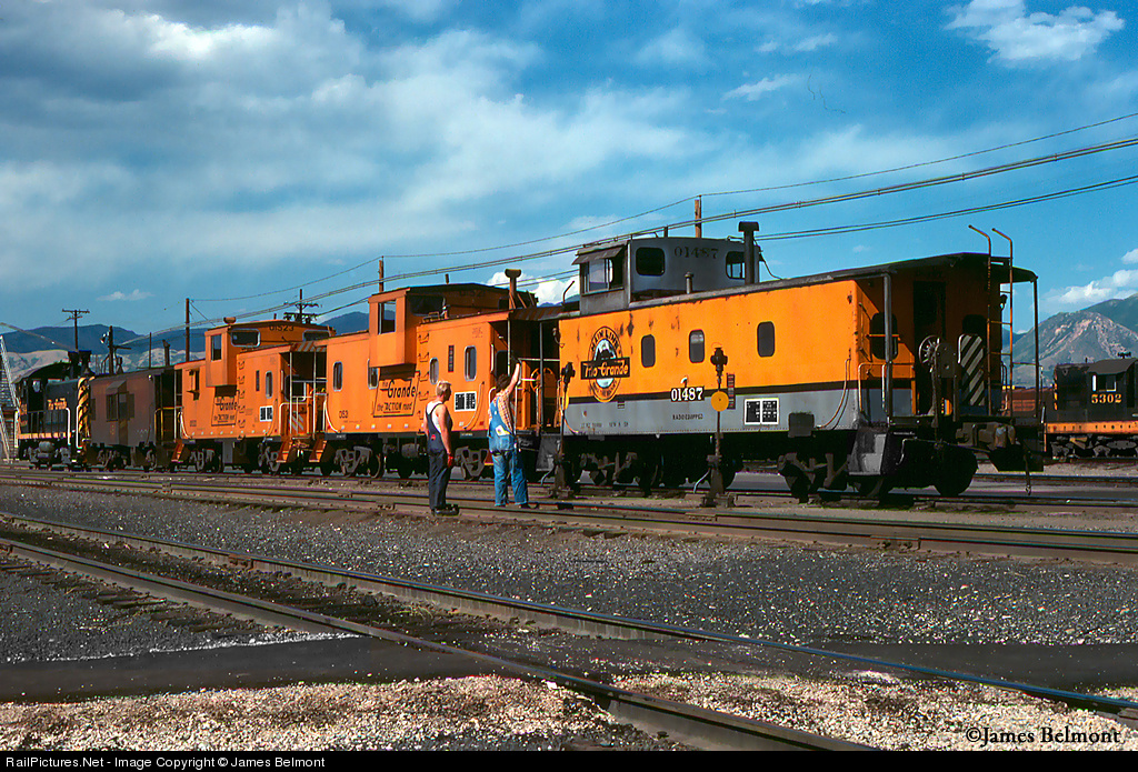 Back when Roper Terminal was a joint Rio Grande and Western Pacific venture, switch engine #134 carefully shuttles three D&RGW and one WP caboose at the west end of the yard. Note the dress code was quite different back in the 1970's...no visi vests or ear protection. It does appear that both the brakeman and trainee are wearing sturdy steel toed boots on this late spring afternoon. D&RGW SD7 #5302 awaits duty on the Short Line Transfer parked along the shop lead at right.