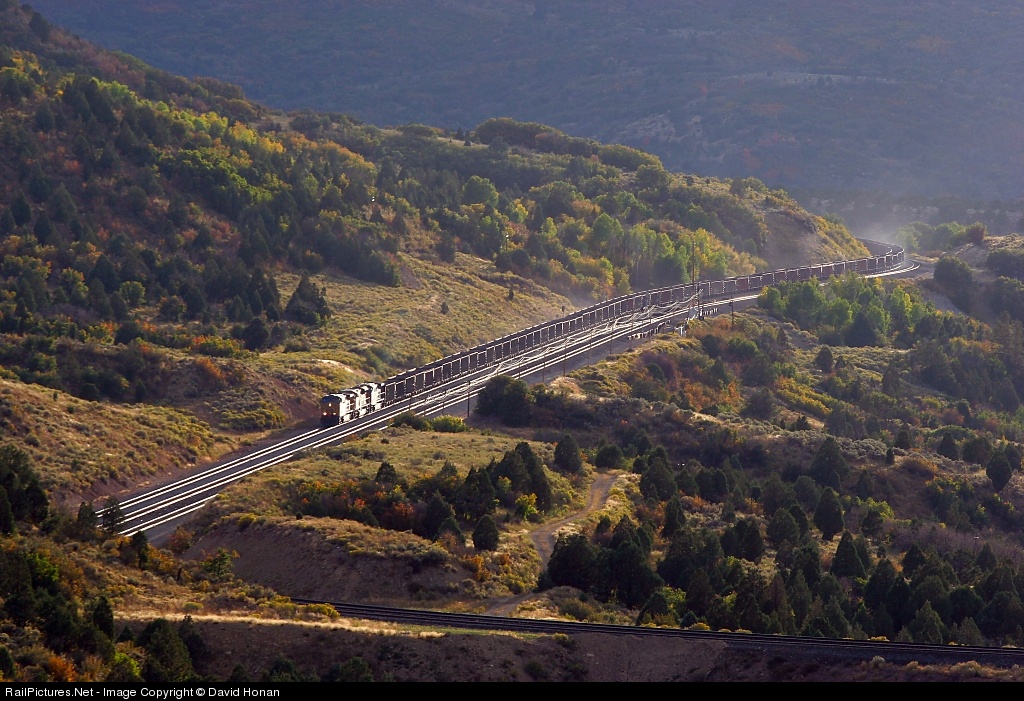 | Late on an intermittently stormy summer afternoon, a loaded UP coal train drops through the Gilluly horseshoes. A cluster of fast-moving clouds had just enough of a gap between them to permit this shot to be captured; the train had traveled less than 10 car lengths before the majority of the scene was again cast in shadows. |