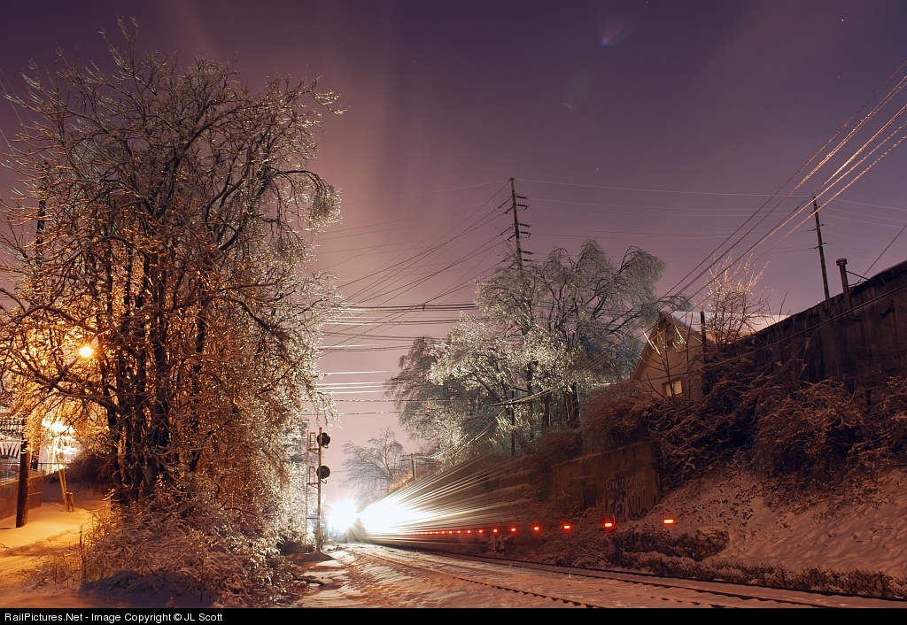 Q231 (right - single main to #1 track) meets Q510 (left - #2 track) at Frankfort Avenue as it heads south toward Osbourne Yard. Several days of ice, snow, and below freezing temperatures have left the region quite picturesque, but also are responsible for a fair amount of damage. While these ice coated trees do look magnificent at night, many others have not fared so well.