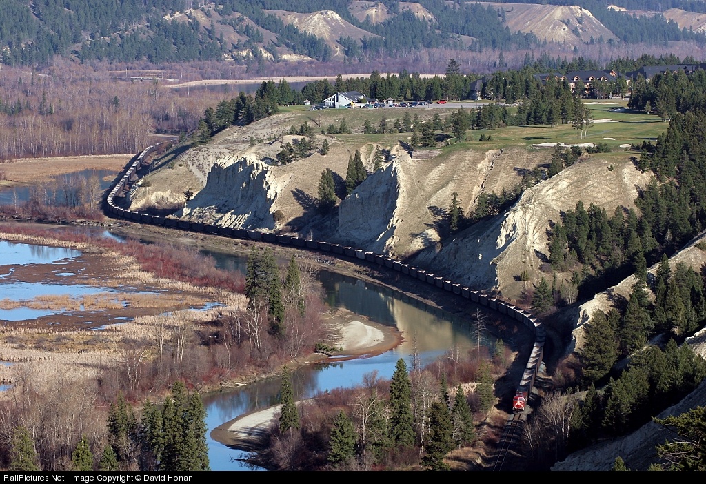 | Early on a gorgeous spring morning, a lone CP unit leads 124 empty coal cars and a DPU southward along the Columbia River on CP's Windermere Sub at Radium Hot Springs, BC. On the bluff above the train is The Springs Course at Radium Resort. |