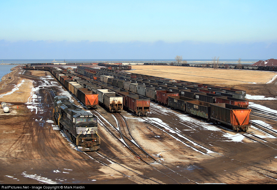 | After sitting all day about 50 yards north (toward Lake Erie in the background) of their location in this photo, a crew got on this set of 80MAC's just to move them one track to the right to couple onto the string of hoppers, job complete. |