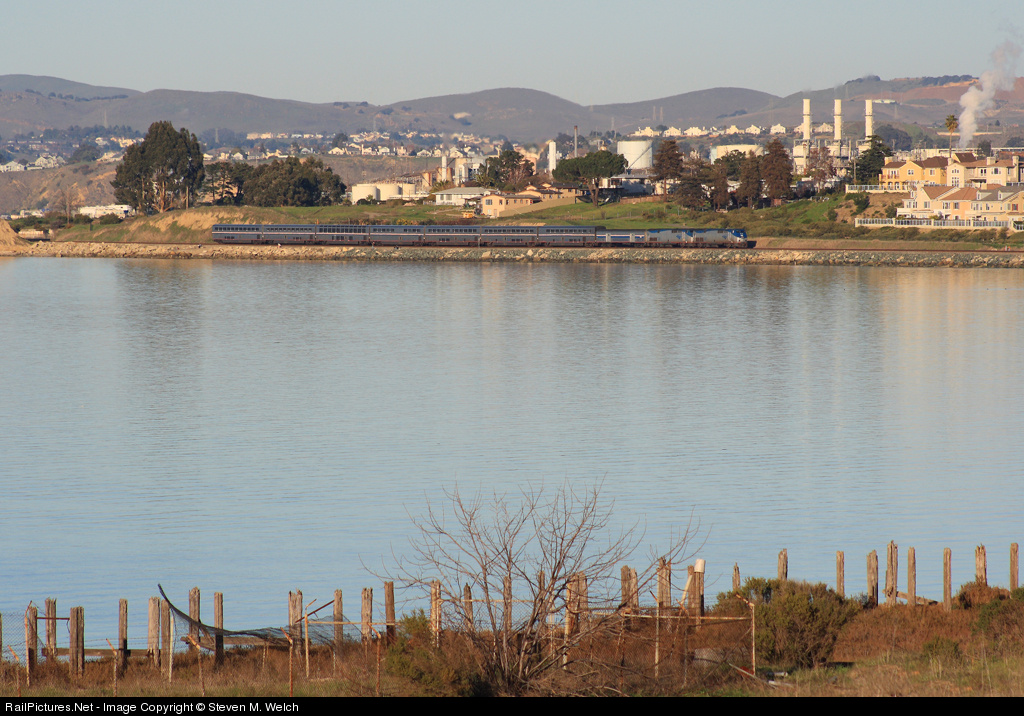 | Running 45 minutes early (WOW!), Amtrak #5, the California Zephyr skirts the San Francisco Bay on a beautiful Winter evening. |