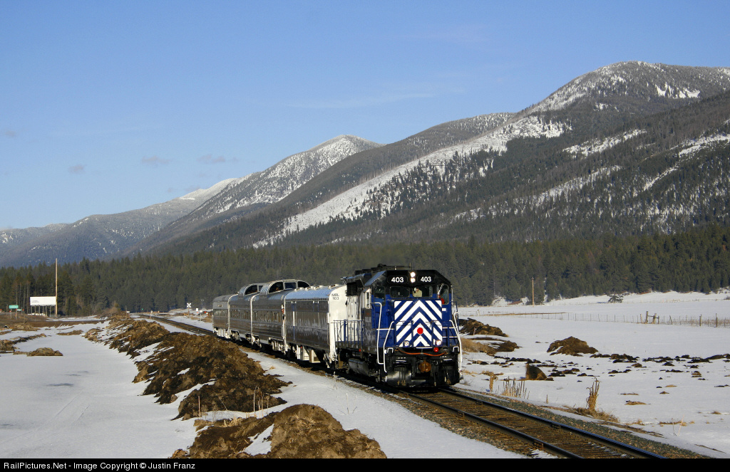 With the sun shinning for the first time in days in the northern Rockies, Montana Rail Link could not have picked a better day then Saturday, Febuary 7, 2009 to operate a passenger extra between Missoula and Dixon, Montana on MRLs 10th Sub. Seen here on the return trip, MRL GP35 403 leads a generator car, two domes and the observation car Silver Cloud past countinued construction along Rte. 93 at Evaro.